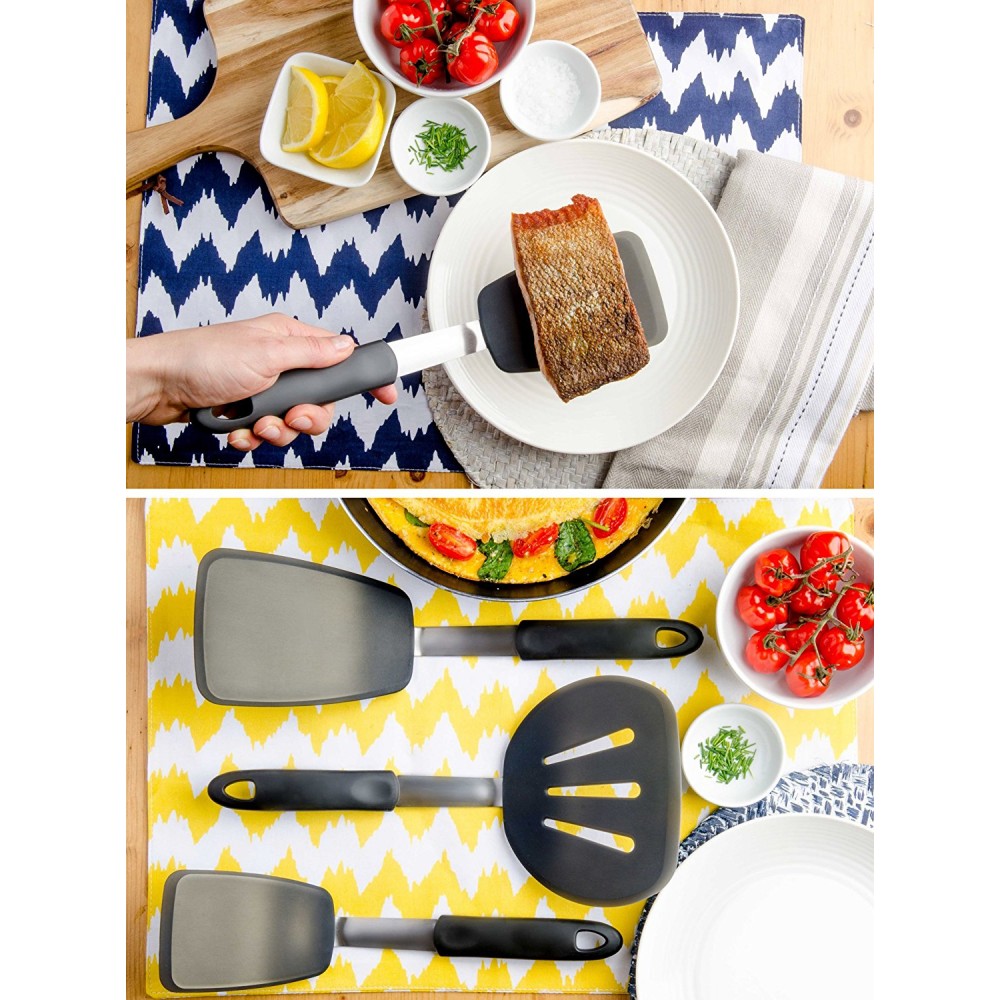 This set of extra flexible and ultra thin spatulas will help you flip and lift many types of food with ease. The ultra thin heads slide smoothly under foods, while the flexibility means you can lift and turn with little effort. From pancakes and omelettes, to cookies, fish, steak and so much more